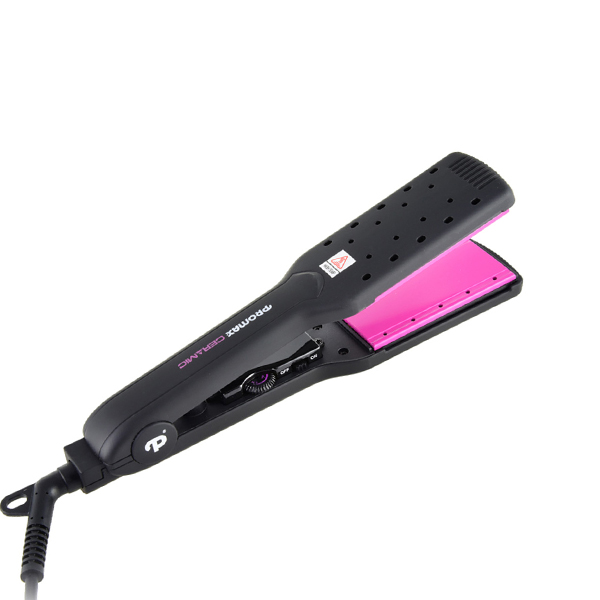 اغلب اوقات برای صاف کردن موها توسط اتو مو باید صبر کرد تا موها کاملاً خشک شوند و یا اینکه ابتدا توسط سشوار موها را خشک کرده و سپس از اتو مو استفاده شود.اما اتو مو سرامیک خشک و تر پرومکس مدل ۵۵۰۰ به کمک صفحات سوراخدار برای صاف کردن موها خشک و مرطوب قابلاستفاده است.عرض صفحات اتو مو ۴۵ میلیمتر و برای موها بلند و متراکم بسیار مناسب است.رطوبت روی موها پس از بخار شدن از سوراخهای تعبیهشده روی صفحات بیرون میزنند.بخار ایجاد شده کار صاف کردن موها را راحت تر می کند و حالت نرم تری به موها میدهد.کلید چرخشی تنظیم دما,دمای صفحات را از ۸۰ تا ۲۱۰ درجهی سانتیگراد تنظیم میکند که از طریق سیستم گرمایشی سریع PTC صفحات در عرض ۳۰ ثانیه گرم میشود.روی بدنهی اتو مو سرامیک خشک و تر پرومکس مدل ۵۵۰۰ از لاستیک ضد لغزشی استفادهشده که از لیز خوردن اتو از دست جلوگیری می کند.سیم برق اتو مو ۳ متر طول داشته و در محل اتصال به بدنه قابلیت چرخش دارد که این قابلیت ضمن راحت کردن کار با اتو مو،از گره خوردن و فرسوده شدن سیم جلوگیری می کند.همچنین در انتهای سیم حلقهای برای آویزان کردن دستگاه بعد از اتمام کار وجود دارد.