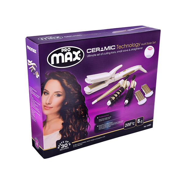 حالتدهندهی مو پرومکس مدل ۴۴۸۰ دستگاهی چندمنظوره برای فرکردن، صافکردن و موجدارکردن موهاست. ۴۴۸۰ دارای ۴ سری مختلف است که شامل سریهای فرکنندهی مخروطی، فرکنندهی متوسط با شانه، فرکنندهی بزرگ با مارپیچ و یک جفت اتو مو میشود. سه عدد فرکنندهای که همراه دستگاه ارائه شدهاند قطرهای متفاوتی دارند و برای ایجاد انواع فر مو استفاده میشوند. فرکنندهی مخروطی قطری برابر ۱۳ تا ۲۵ میلیمتر دارد. فرکنندهی استوانهای متوسط قطری ۱۹ میلیمتری دارد و دارای گیرهی مو است. یک عدد شانه با همین قطر روی این فرکننده قرار میگیرد که برای حالتدادن و حجمدادن به موها بسیار مناسب است. فرکنندهی آخر که از همه بزرگتر است، استوانهای به قطر ۲۶ میلیمتر است که گیرهی مو هم دارد. روی این فر کننده یک شانهی مارپیچ با همین قطر قرار میگیرد که برای ایجاد فر مارپیچ مناسب است. سری اتو مو نیز شامل یک جفت صفحهی صافکننده میشود که طول و عرضی برابر ۷۵ در ۲۹ میلیمتر دارد. نکتهی جالب در مورد این صفحات این است که سمت دیگر آنها حالت زیگزاگ دارد و برای موجدارکردن موها استفاده میشود. برای این منظور کافی است که صفحات اتو مو را به شکل کشویی بیرون کشیده و از سمت دیگر آنها استفاده شود. روی تمام سریهایی که به آنها اشاره شد، لایهای از سرامیک کشیده شده است تا در اثر حرارت زیاد آسیب کمتری به موها وارد شود. دمای المنت حرارتی حالتدهندهی مو پرومکس مدل ۴۴۸۰ تا ۲۰۰ درجه سانتیگراد بالا میرود. به کمک سیستم گرمایش سریع، در مدتزمان ۳۰ ثانیه سریها به این دما میرسند. از دیگر اقلام همراه این حالتدهندهی مو پرومکس مدل ۴۴۸۰ باید به سه عدد کلیپس مو اشاره کرد. برای نگهداری از دستگاه و سریهای متنوعش یک عدد کیف نگهداری نیز ارائه شده که پارچهای است و کیفیت خوبی دارد. بهطورخلاصه حالتدهندهی مو پرومکس ۴۴۸۰ دارای سه سری فرکننده، یک جفت موجدارکننده و صافکننده است که توسط لایهای از سرامیک پوشش داده شدهاند و تا دمای ۲۰۰ درجهی سانتیگراد گرم میشوند و برای ایجاد انواع حالتهای مو استفاده میشوند. خرید این اتو مو چند کاره به کسانی که به آرایش مو در خانه علاقه دارند توصیه میشود.