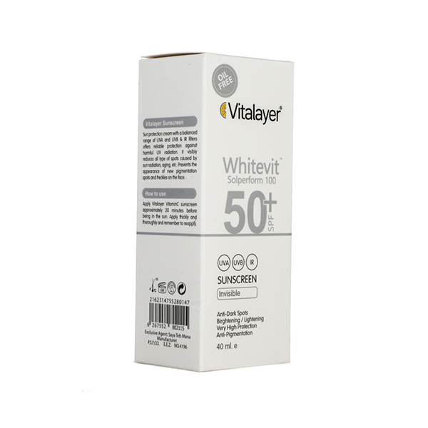 كرم ضد آفتاب وايت ويت ويتالير(Vitalayer)با SPF+50 حاوی انواع فیلترها فیزیکی و شیمیایی است که مقاومت بالایی در برابر اشعهها UVA،UVB و IR دارند که دارای بافتی سبک،زود جذب و مناسب برای انواع پوست است طوریکه اثربخشی آن توسط متخصصین پوست تایید شده است ویتامین C لیپوزمال یکی از مهمترین مواد تشکیلدهنده فرمولاسیون كرم ضد آفتاب وايت ويت ويتالير،آنتی اکسیدان و یک روشنکننده قدرتمند پوست و دارای خواص ضد چروک است.همچنین هیالورونیک اسید موجود در این کرم با افزایش جذب رطوبت و پر کردن فضای بین کلاژن و الاستین موجب شادابی،جوانی،افزایش قوام و حجم پوست میشود.از طرفی آلانتوئین موجود در كرم ضد آفتاب وايت ويت ويتالير نه تنها ضدالتهابی قوی بوده بلکه به همراه پتنت اختصاصیO.D.A Whiteمانع از ایجاد لک ناشی از جوش،آفتابسوختگی و…میشود Solperform 100 از دیگر پتنت اختصاصی این محصول است که اثربخشی فیلترها كرم ضد آفتاب وايت ويت ويتالير(Vitalayer)را تا 70% افزایش میدهد.این کرم ضد آفتاب فاقد چربی و پارابن است همچنین در برابر رطوبت و تعریق مقاوم است تا حتی در محیطها و شرایط آبوهوایی مرطوب هم کاملاً کاربردی باشد.