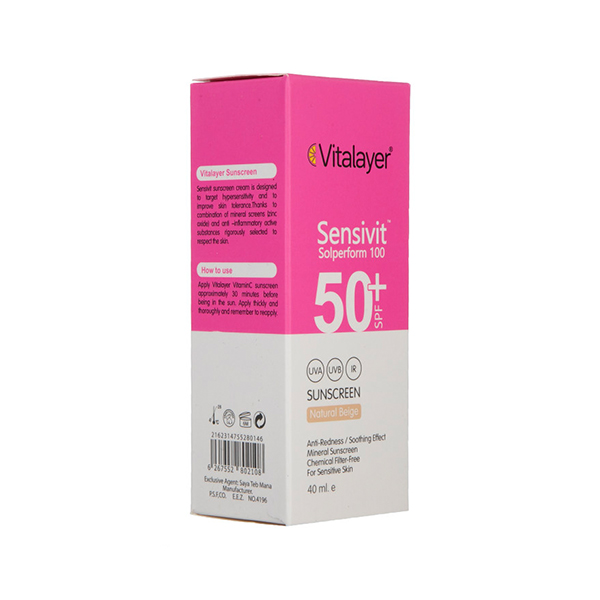 كرم ضد آفتاب سنسى ويت ويتالير(Vitalayer)فاقد انواع مواد حساسیت زا که اختصاصآ برای پوستها حساس و رزاسه فرموله شده که اثربخشی آن توسط متخصصین پوست تایید شده است.این ضد آفتاب دارای SPF+50است که برای محافظت از انواع پوستها روشن،گندمی و تیره کاربرد دارد.در تولید این ضد آفتاب از پتنت انحصاری Solperform 100 استفادهشده که موجب تسهیل پخش فیلترها ضد آفتاب بر روی پوست میشود،همچنین اثرگذاری فیلترها ضد آفتاب را تا 70% افزایش میدهد.هیالورونیک اسید از بهترین مواد موجود در كرم ضد آفتاب سنسى ويت ويتالير،با خاصیت آبرسانی فوق العاده قوی هست همچنین دکسپنتنول و آلانتوئین به کار رفته با خاصیت ضدالتهابی و ضد قرمزی،از پوست در برابر آفتابسوختگی و التهاب ناشی از آن حفاظت میکند و باعث ترمیم بافتها آسیب دیده میشوند همچنین وجود آلوئه ورا در این کرم علاوه بر خاصیت ضد التهابی به رطوبت رسانی پوست کمک شایانی میکند.كرم ضد آفتاب سنسى ويت ويتالير دارای بافتی سبک و مقاوم در برابر تعریق و رطوبت است(خصوصآ آب و هوای شرجی)همچنین فاقد چربی،پارابن و حتی فیلترها شیمیایی است!طوریکه خانم ها باردار هم قادر به استفاده از آن هستند.