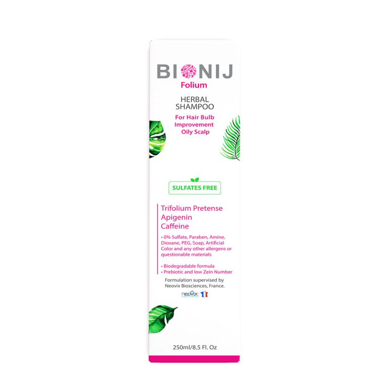 شامپو گیاهی Folium بیونیج:افزایش سن، آسیبرسانهای خارجی مانند آلودگی هوا، امواج ماورا بنفش نور خورشید، رادیکالهای آزاد و… بر عملکرد فولیکول و پیاز مو اثرات منفی دارند. این عوامل موجب کاهش حجم پیاز مو و رویش موهای نازکتر و نیز تضعیف فولیکول و کاهش استحکام مو در آن و در نتیجه ریزش موها شده و منجر به کاهش تراکم و کاهش رشد مو میشوند.شامپوی گیاهی تقویتکننده پیاز مو برای پوست سر چرب بیونیج با pH متناسب با پوست سر و با تنظیم ترشح چربی پوست سر بدون آسیب به سبوم مفید پوست سر، چربی و آلودگیها را از پوست سر بر طرف میکند همچنین ترکیبات گیاهی موجود در این شامپو موجب تقویت عروق خونی و افزایش جریان خون مویرگی میشوند و از فولیکول و پیاز مو در برابر آسیب رسانهای خارجی محافظت مینمایند. همچنین این شامپو با مهار فعالیت آنزیم 5-آلفا ردوکتاز و طولانی کردن فاز آناژن، ریزش مو را کنترل نموده و موجب افزایش استحکام و ضخامت موهای کرکی میشود.