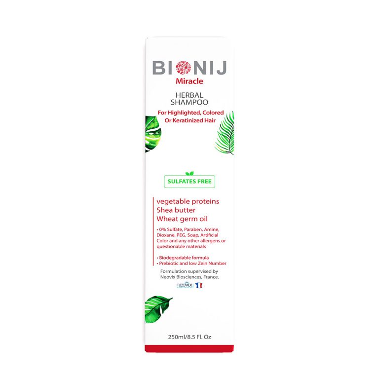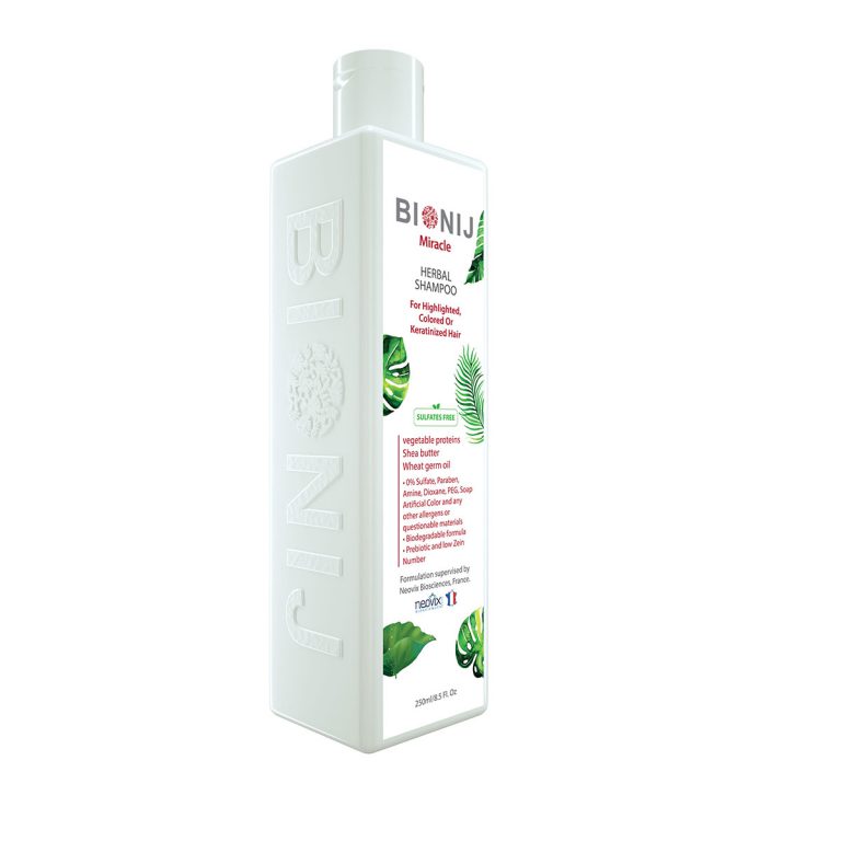شامپو گیاهی Miracle بیونیج:رنگ کردن موها که از متداولترین روشهای افزایش زیبایی موهاست، در اکثر مواقع اثرات نامطلوبی روی پوست سر و ساقه موها ایجاد میکند. خشک شدن ساقه موها و پوست سر، مات و کدر شدن تار موها، گره خوردن موها و کاهش حالت پذیری آن و آسیبدیدگی از رایجترین مشکلات مو پس از رنگ کردن است.شامپوی گیاهی مخصوص موهای رنگ، هایلایت یا کراتین شده بیونیج با آبرسانی مؤثر به موها موجب نرمی و لطافت آن شده و از موها در برابر اشعههای مضر UVA,UVB خورشید و تغییر رنگ محافظت مینماید. ترکیبات این شامپو، بهطور موثری موجب تسکین پوست سر و تقویت آن شده و از شکنندگی و نازکی تار موها، موخوره و خارش پوست سر پیشگیری مینماید. تقویت و آبرسانی عمیق موجب انعطافپذیری بیشتر و استحکام موها میشود بهطوریکه آسیبهای ناشی از مواد شیمیایی رنگ مو التیام یافته، شوره خشک، پوسته ریزی، ریزش غیرطبیعی موها و سایر مشکلات مربوط به آن نیز رفع میگردد. همچنین به دلیل وجود ترکیبات تغذیهکننده و بستن فولیکول موها، موجب افزایش عمر کراتین شده که ایده آل برای موهای کراتین شده است.